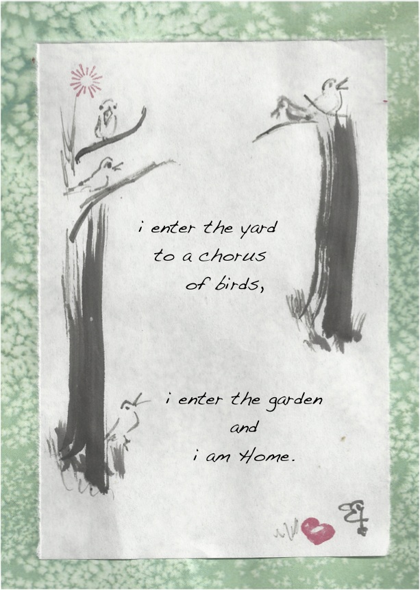 This entry was posted in The Now and tagged animals, art, bird songs, blessings, choir, chorus, eco-chaplaincy, eco-ministry, eco-spirituality, Garden of Eden, ink brush painting, listening, mysticism, paradise, sumi-e. Bookmark the permalink.