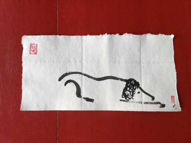 The dog lies beside me while I meditate,