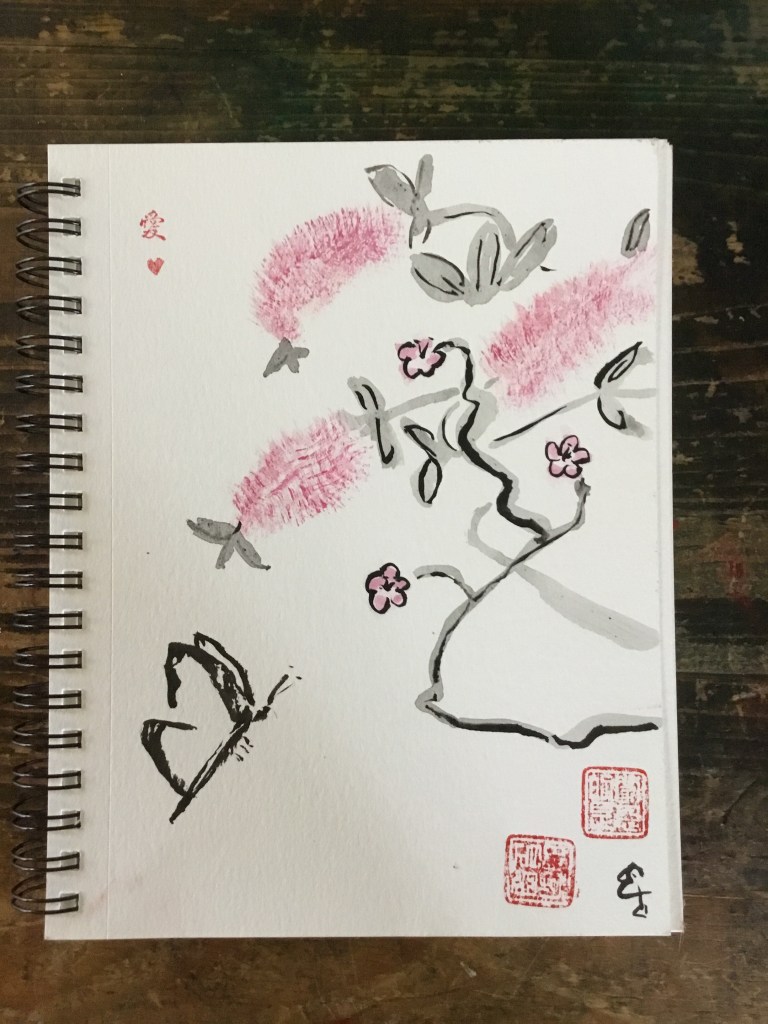 With Her branches intertwined with the budding ornamental cherry