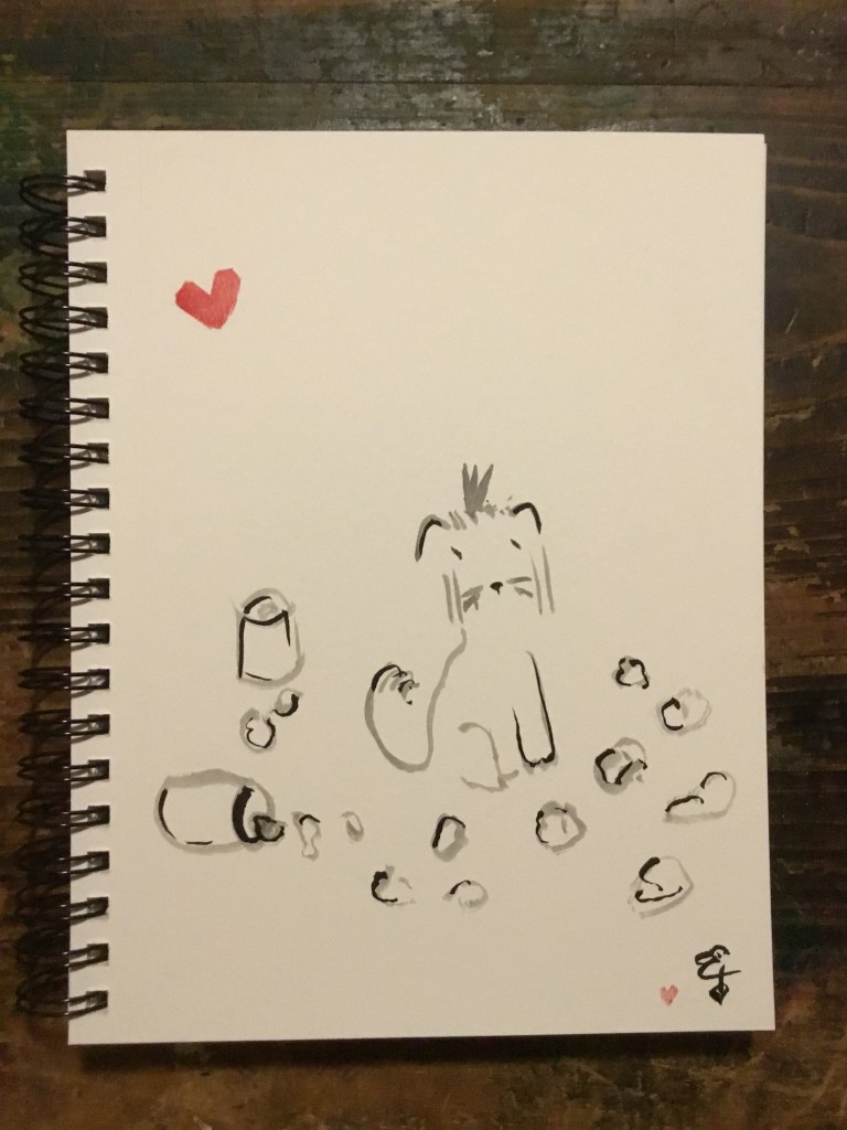 The tail-less lizard sits beside me on the arm of the chair,